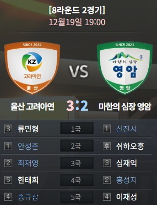 울산 고려아연은 전반기에 영암에게 당했던 1-3 패배를 설욕하며 파죽의 5연승을 달렸다. 반면 시즌 3승 5패가 된 영암은 패배한 5경기를 모두 2-3으로 내주며 최종국 징크스에서 벗어나지 못했다.