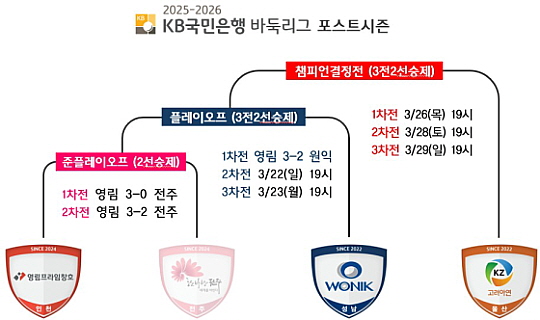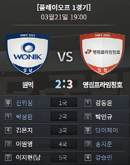 플레이오프 1차전을 승리한 영림프라임창호는 지난 시즌 챔피언 결정전부터 이날까지 포스트시즌 5연승 가도를 달렸다. 역대 플레이오프 1차전 승리 팀의 챔피언 결정전 진출 확률은 69.2%. 영림프라임창호가 유리한 고지를 선점했다. 플레이오프 2차전은 22일(일) 바로 속개된다.