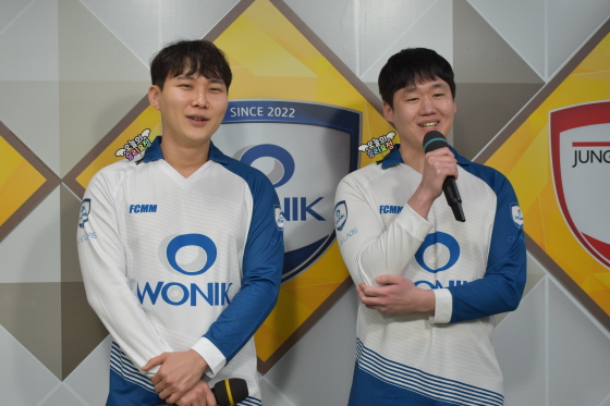 ▲ 내일 3차전 예상 스코어를 묻는 질문에 “사실 이기기만 한다면 아무리 늦게 끝나도 스코어는 상관없다”고 답한 박정환(왼쪽)과 “영림이 워낙 강팀이라 분위기를 내주지 않기 위해 최대한 빨리 끝내고 싶다”고 밝힌 이원영