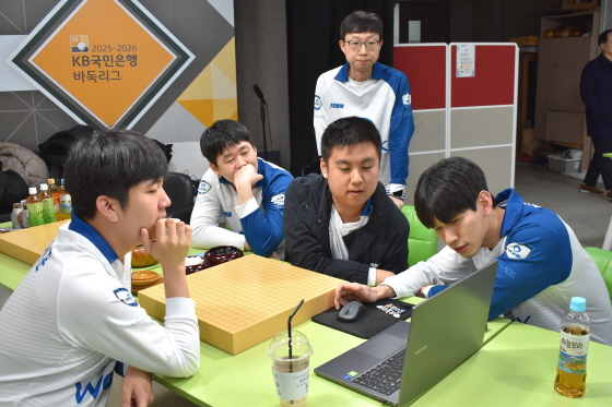 ▲ 진위청이 위기에 빠졌던 1국 승부처 장면을 인공지능으로 검토하고 있는 원익 선수단