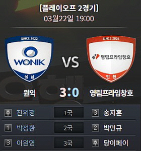 원익이 전날의 충격적인 역전패를 완벽하게 설욕했다. 진위청·박정환·이원영이 한 치의 빈틈도 허용하지 않고 몰아붙였다. 포스트시즌에서 무패 행진을 질주했던 영림프라임창호의 포스트시즌 연승 행진도 ‘5’에서 멎었다.