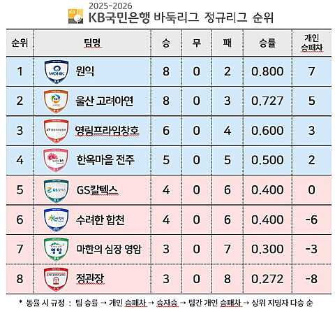 ○● 2025-2026 KB국민은행 바둑리그는 8개 팀이 더블리그 방식으로 총 14라운드 56경기를 치른다. 정규리그 상위 4개 팀이 포스트시즌에 진출해 우승 상금 2억 5,000만원을 놓고 최종 대결을 펼친다. 매 경기 5판 3선승제로 진행되며, 기본 시간 1분에 착수할 때마다 15초가 추가되는 피셔 룰 방식이 적용된다.