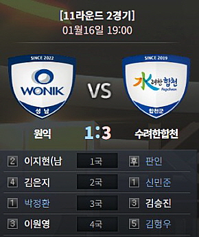전반기 맞대결에서 이지현이 불계승을 거둔 데 이어 후반기 리턴 매치. 최근 3연패 부진에 빠져 있는 이지현이 원익의 선봉장으로 나섰다. 수려한 합천은 9라운드부터 3주 연속 호출을 받은 외국인 선수 판인이 선발로 출격했다.