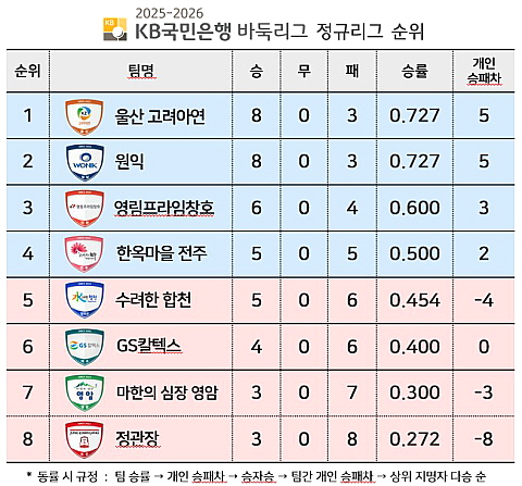 이날 패배로 원익은 5라운드 이후 굳게 지켜온 선두 자리를 울산 고려아연에게 내주고 말았다. 두 팀은 승률(8승 3패), 개인 승패 차(+5)까지 모두 같았으나, 승자승 원칙에 따라 순위가 갈렸다. 한편 선두를 꺾는 파란을 일으킨 수려한 합천은 5위로 올라서며 GS칼텍스와 자리를 맞바꿨다.